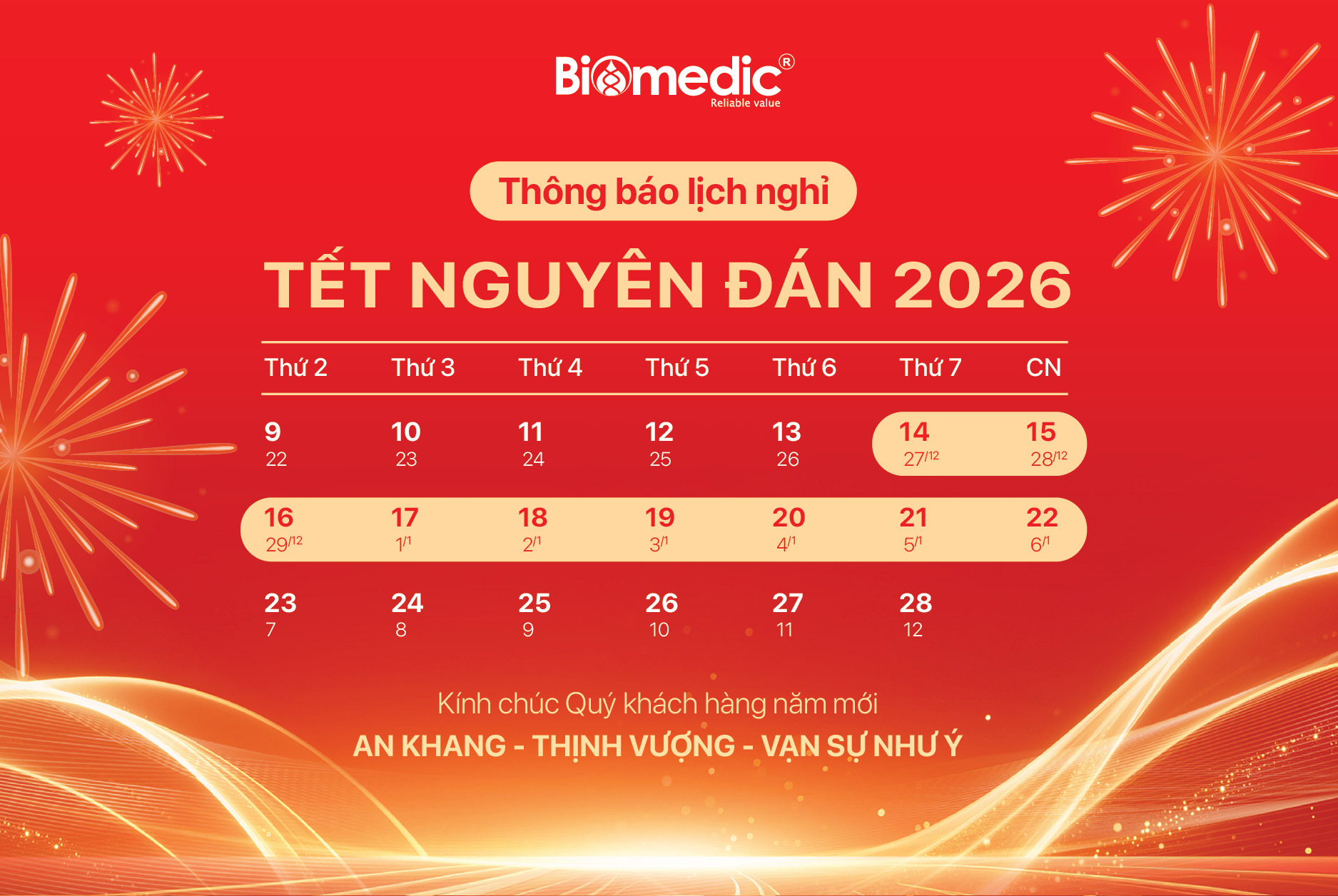 Biomedic thông báo lịch nghỉ Tết Nguyên đán 2026